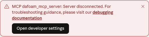 Occasionally, you may see the error shown below when opening the Claude Desktop app. If this happens, the DAFoam MCP server is not loading properly. You can simply force-quit Claude and reopen it. The error should disappear.