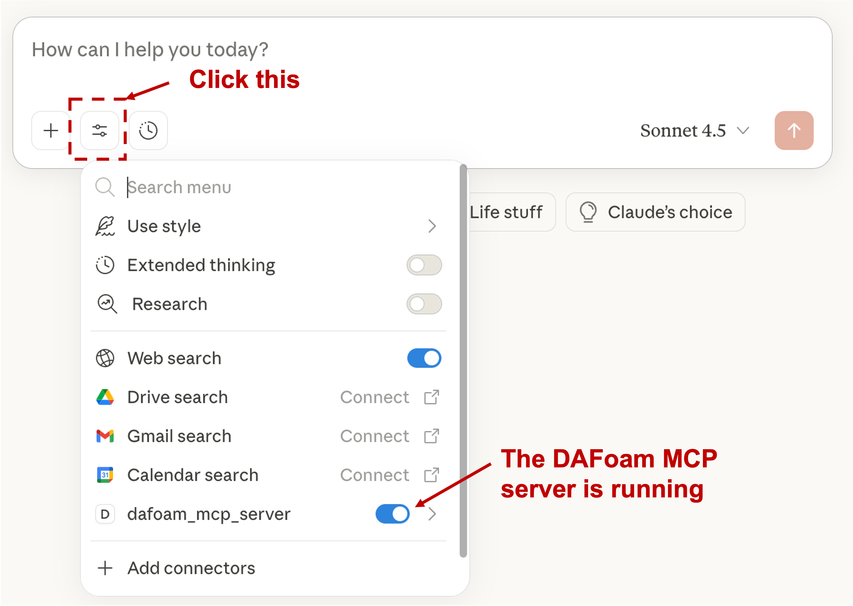 IMPORTANT! You need to close and re-open Claude Desktop to make the new MCP effective. NOTE: On Mac, you may need to Force Quit the Claude desktop application before you re-open it. Once the Claude Desktop is re-open, you can click the “Search and Tools” button to verify if the DAFoam MCP server is running. See the picture below. For developers: If you see an error, the logs file are in ~/Library/Logs/Claude/mcp-server-dafoam_mcp_server.log