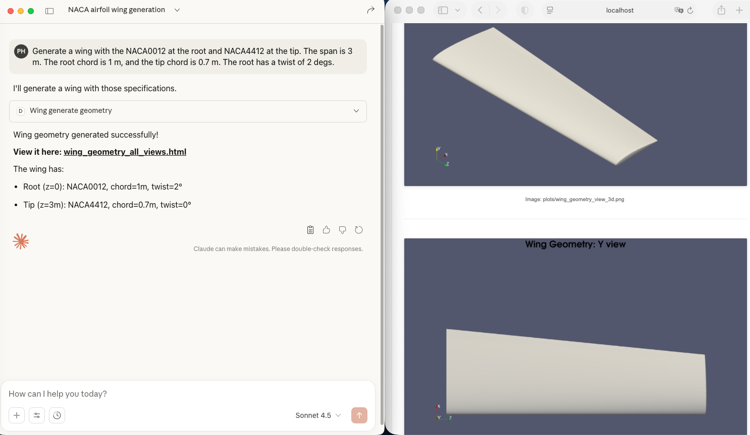 Geometry generation. To generate the CAD wing geometry mesh, you can ask Claude: “Generate a wing with the NACA0012 at the root and NACA4412 at the tip. The span is 3 m. The root chord is 1 m, and the tip chord is 0.7 m. The root has a twist of 2 degs.”. Once Claude generates the mesh, you can click the provided link to view the geometry in your browser.