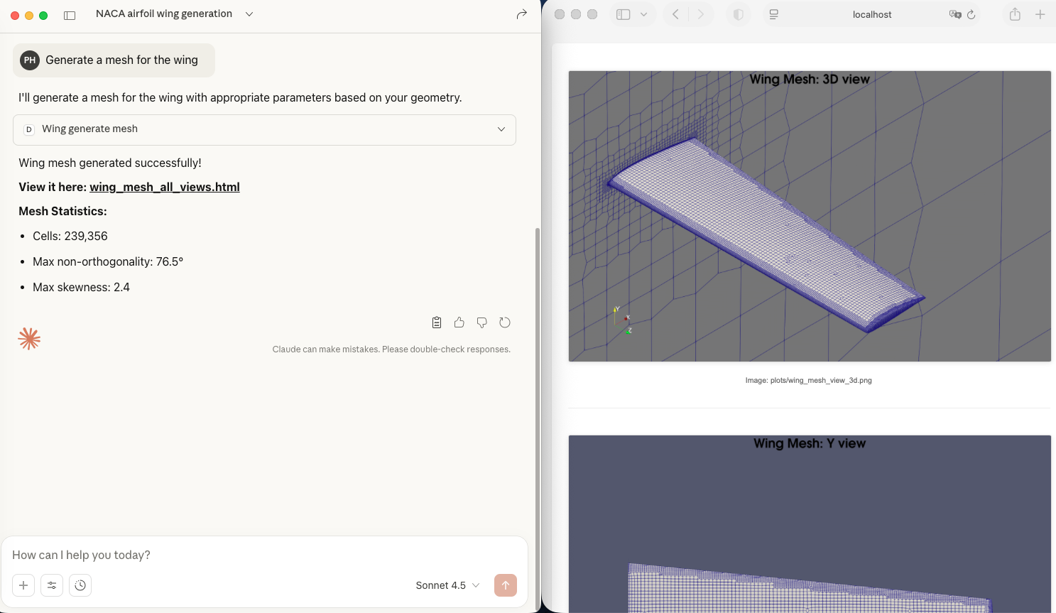 Mesh generation. To generate the wing mesh, you can ask Claude: “Generate a mesh for the wing”. Once Claude generates the mesh, you can click the provided link to view the mesh in your browser. To adjust the mesh density, you can change the mesh refinement level, number of boundary layer mesh, and far field mesh size.
