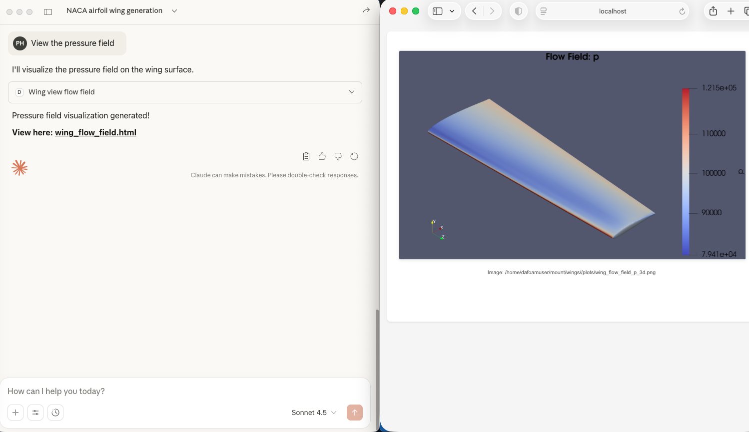 Run CFD simulations. You can ask Claude: “Run a CFD with Ma=0.5, Re=1e6, and aoa=1.5 deg”. Claude will run the CFD simulation in the background.