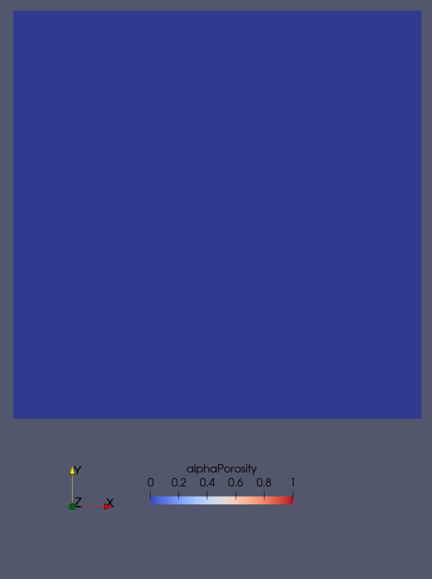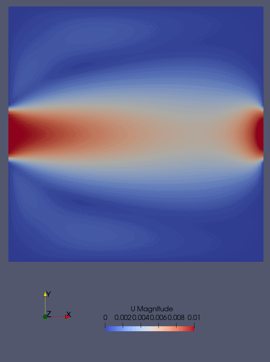 Case: Conjugate heat transfer topology optimization Geometry: A square channel Objective function: Weighted total pressure loss and outlet temperature Design variables: 6400 porosity values in the flow field Constraints: None Reynolds number: 1000 (laminar flow) Mesh cells: 6400 Solver: DATopoChtFoam