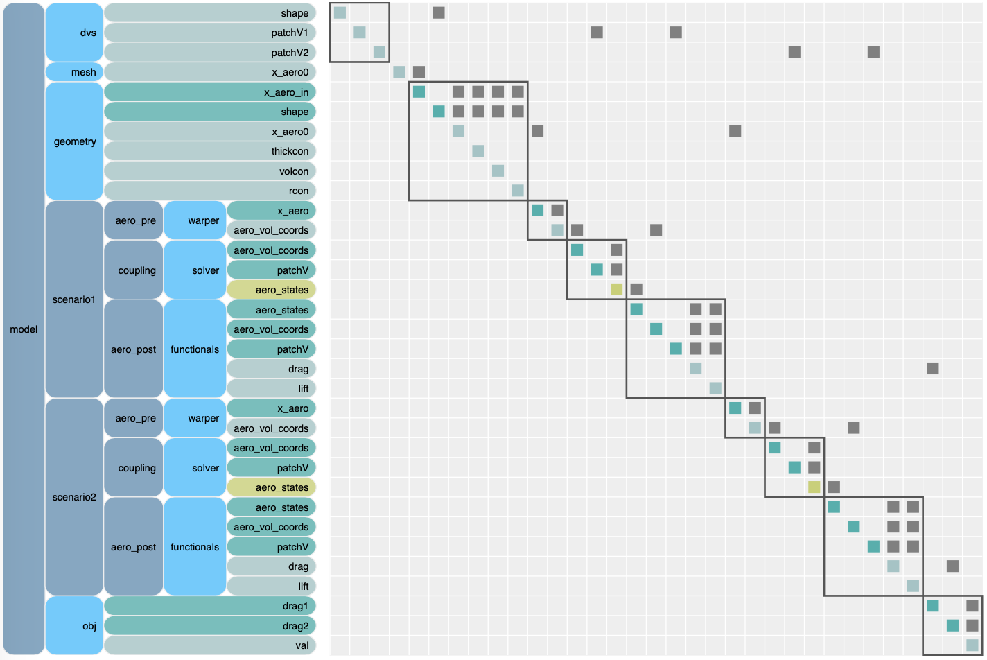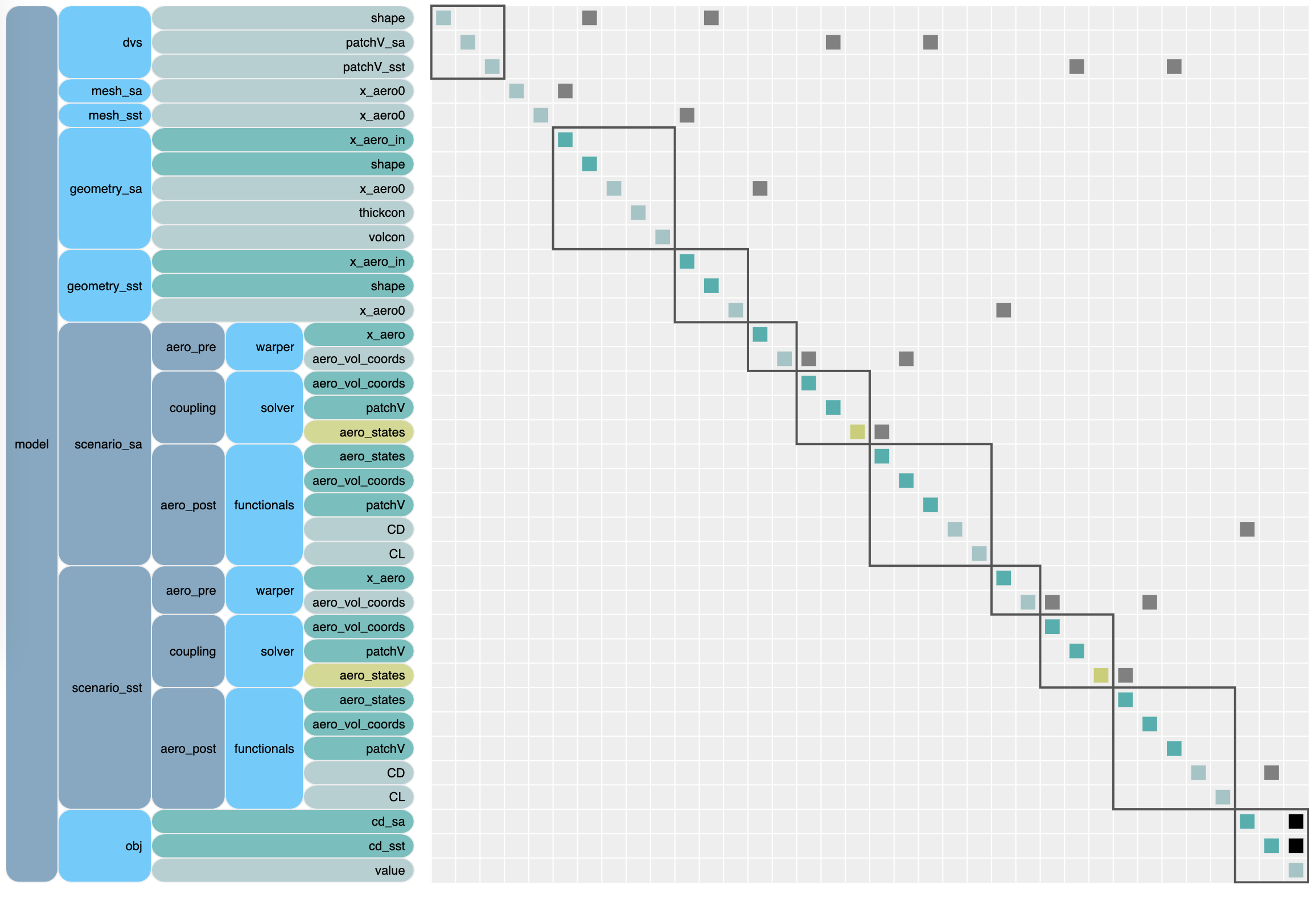 Examining the N2 diagram, we observe that there is only one geometry, and the x_aero0