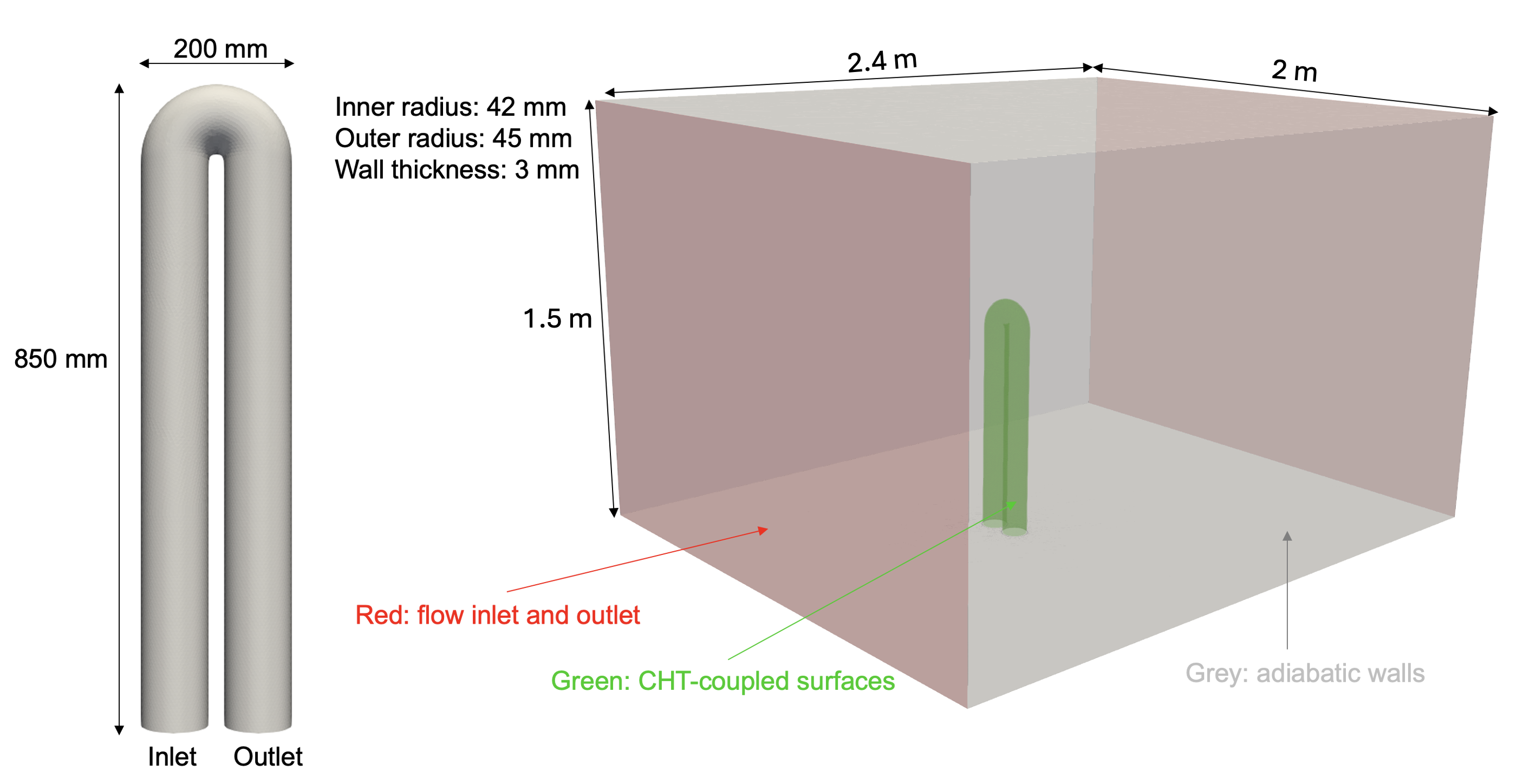 The U-bend pipe has four surfaces which need to be specified: the inner surface of the pipe (ubend_inner_solid), the outer surface of the pipe (ubend_outer_solid), and the wall surface of the pipe at the inlet and outlet (inlet_solid and outlet_solid). For this optimization case, we have two sets of CHT interfaces (inner and outer surfaces of the pipe) which take on the mixed (also known as robin type) boundary condition. We use this type of boundary condition as we must balance between temperature and heat flux at the CHT interface. The two wall surfaces at the inlet and outlet are left as zero gradient since this pipe is representative of a system of pipes. This means the pipe is connected to a pump system which pumps fluid through mutliple U-bends, not just one.